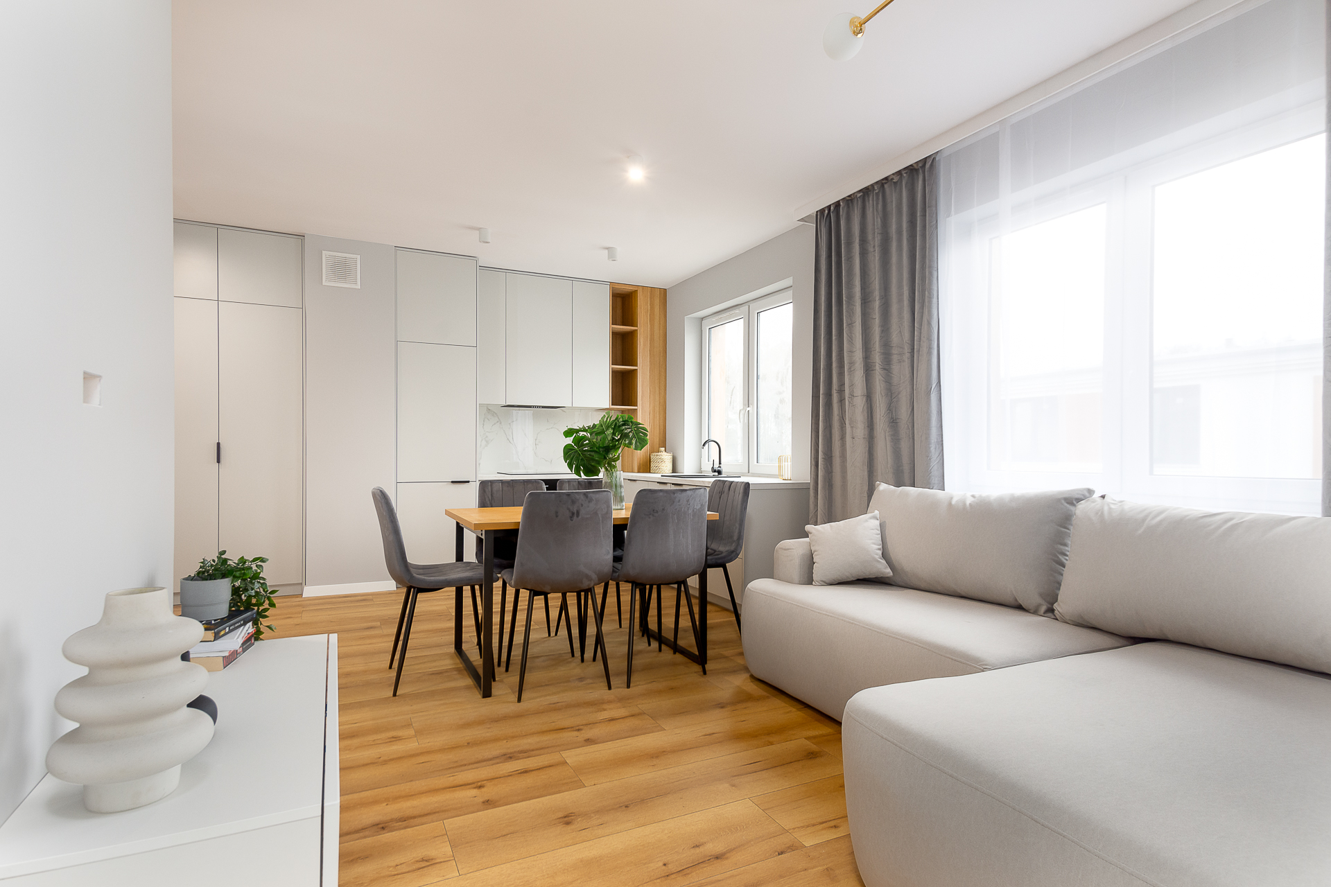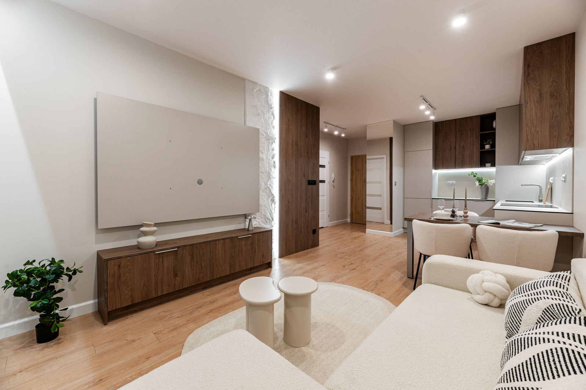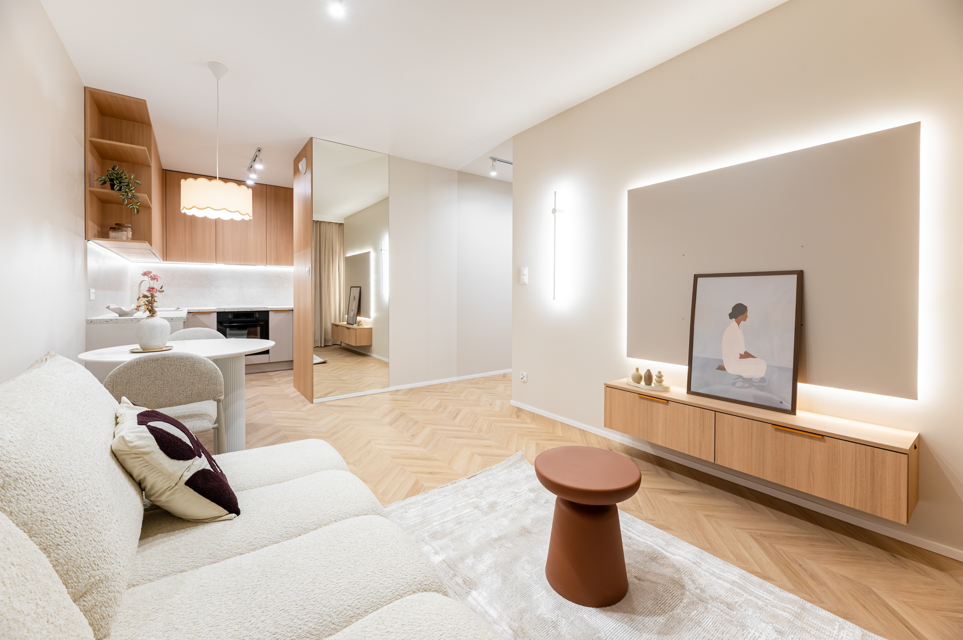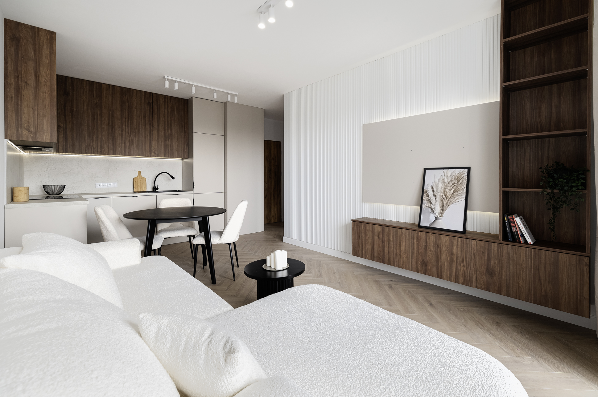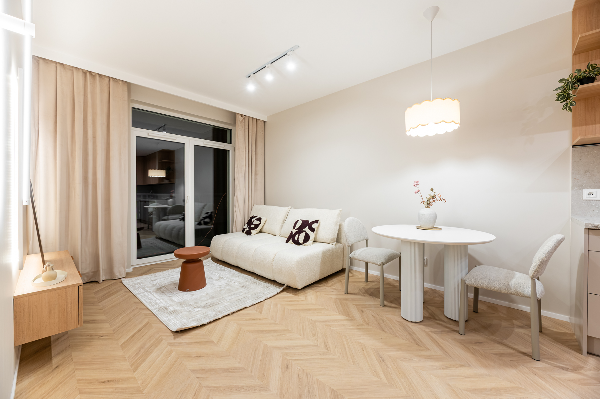 Kompletnie urządzone mieszkanie z kuchnią na wymiar, pełnym AGD i meblami – wchodzisz na gotowe z samymi walizkami.
