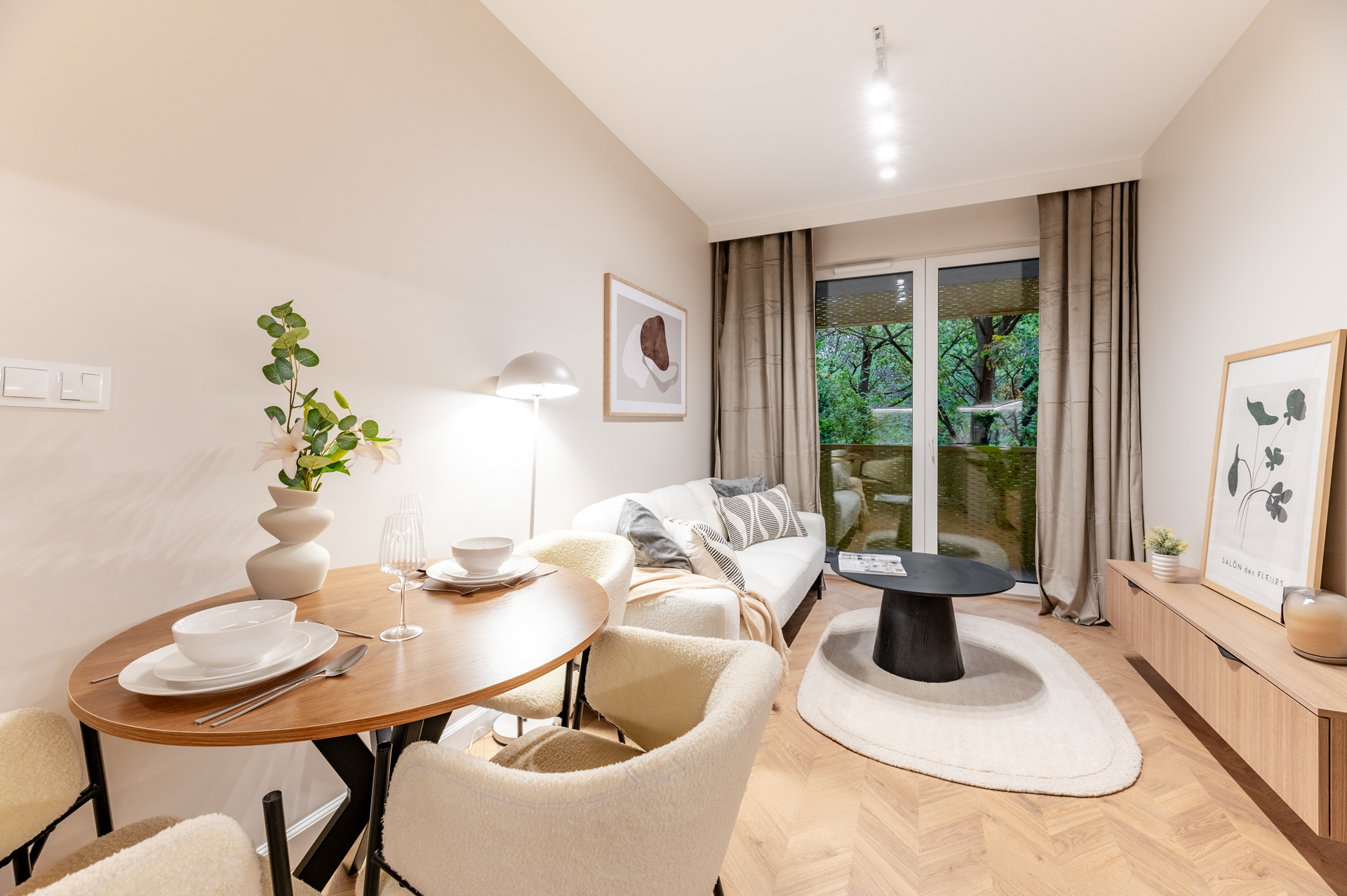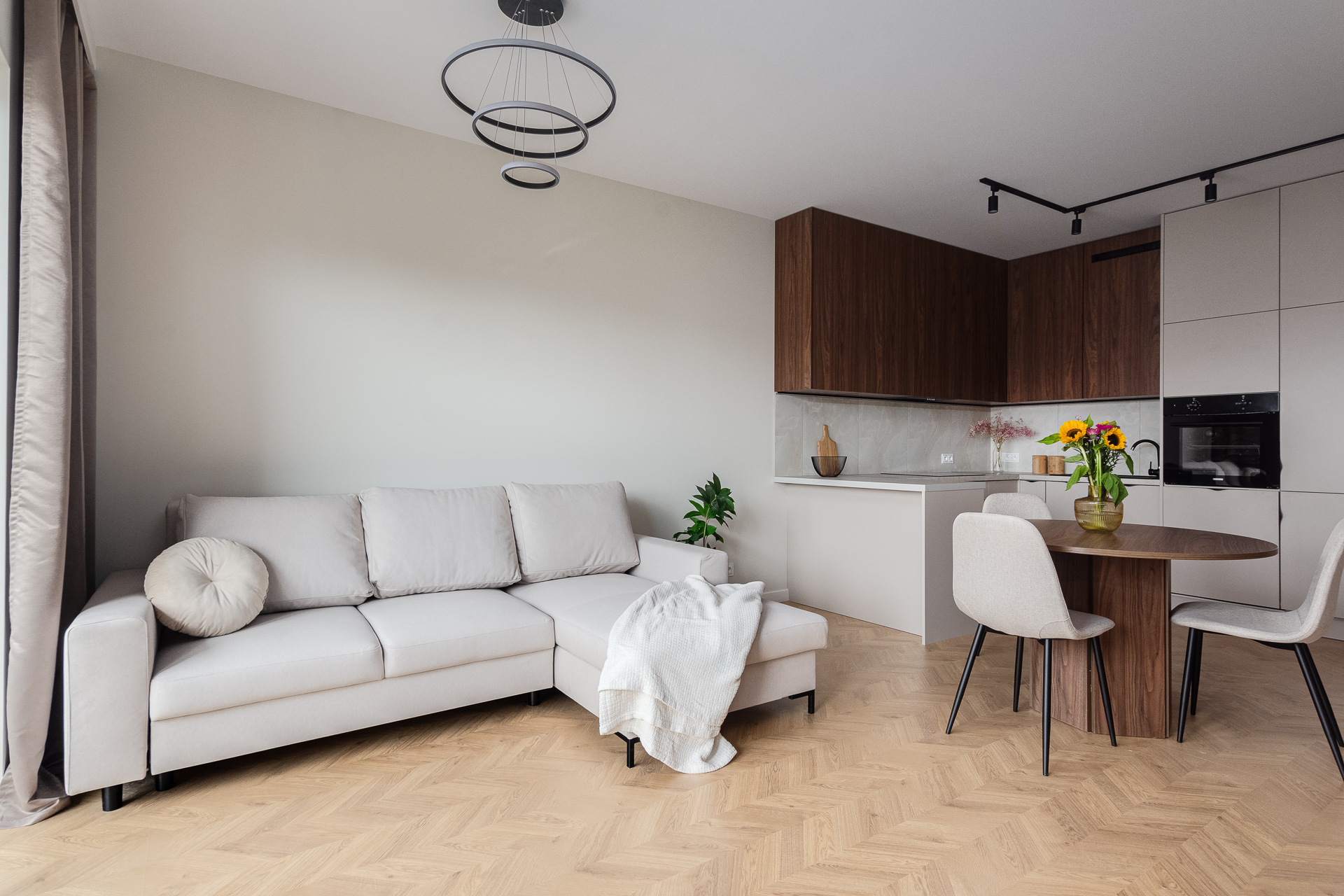 Gotowe do zamieszkania: Zapewniamy meble ruchome – kanapę w salonie, łóżko w sypialni oraz stół z krzesłami.