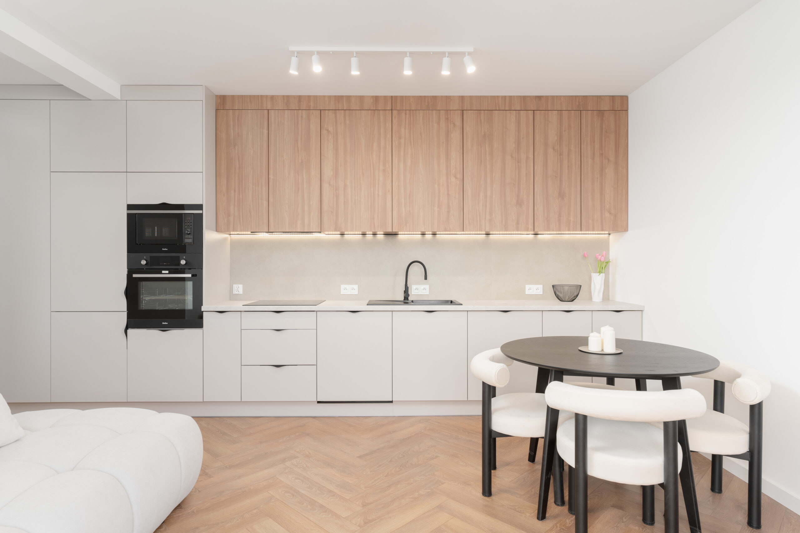 Najwyższy standard stolarki: Zabudowy meblowe z frontami premium i blatami ze spieku kwarcowego lub konglomeratu kamiennego – trwałość i prestiż na lata.