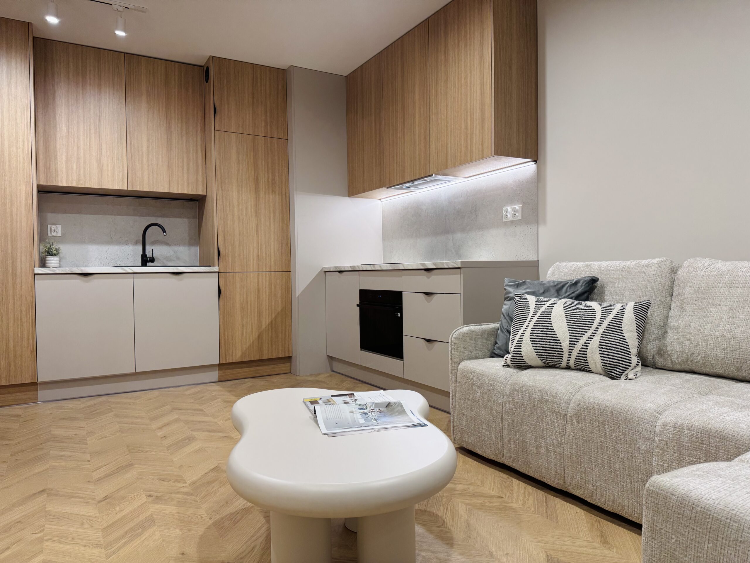 z kuchnią na wymiar, pełnym AGD i meblami.